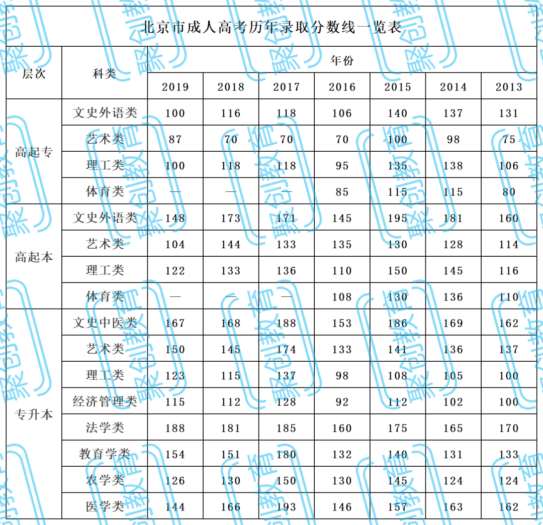 2020年北京市成人高校招生录取最低控制分数线
